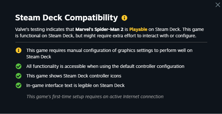 Na Steam Deck, Spider-Man 2 mostra-se jogável, mas longe do ideal. Após alguns patches, o jogo chegou a ser “Verified” por breves momentos em fevereiro, mas acabou por ser reclassificado para “Playable” no final de março de 2025.