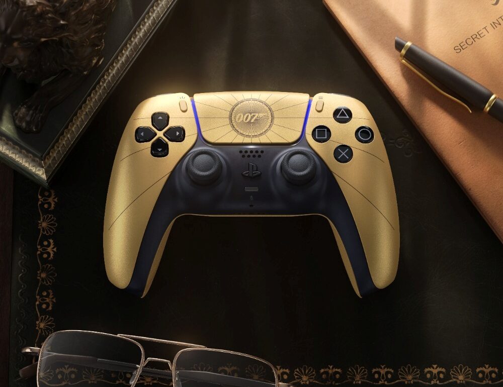 Este DualSense especial apresenta um visual distinto, com acabamento dourado e elementos visuais inspirados no icónico agente secreto James Bond.
