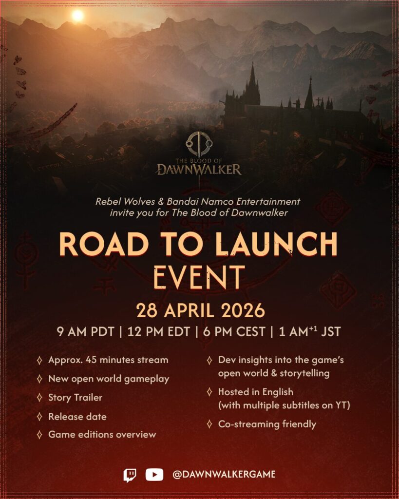 A Rebel Wolves, em conjunto com a Bandai Namco Entertainment, convida-te para o stream Road to Launch Event, no dia 28 de abril, durante o qual irá partilhar detalhes aguardados há muito sobre o RPG de ação The Blood of Dawnwalker, incluindo a sua data de lançamento.
