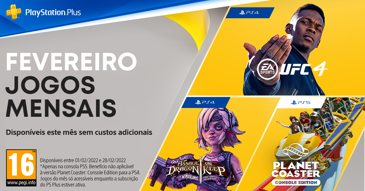 A Sony Interactive Entertainment (SIE) anunciou hoje, dia 26 de janeiro, através do Blog Oficial da PlayStation, quais os jogos do mês de fevereiro de 2022 no PlayStation®Plus que estarão disponíveis para transferência a partir da próxima terça-feira, dia 1 de fevereiro e até ao dia 28 de fevereiro de 2022: UFC 4 para a PlayStation®4, Planet Coaster: Edição de Consola para a PlayStation®4 e para a PlayStation®5 e Tiny Tina’s Assault on Dragon Keep: A Wonderlands One-shot Adventure para a PlayStation®4.