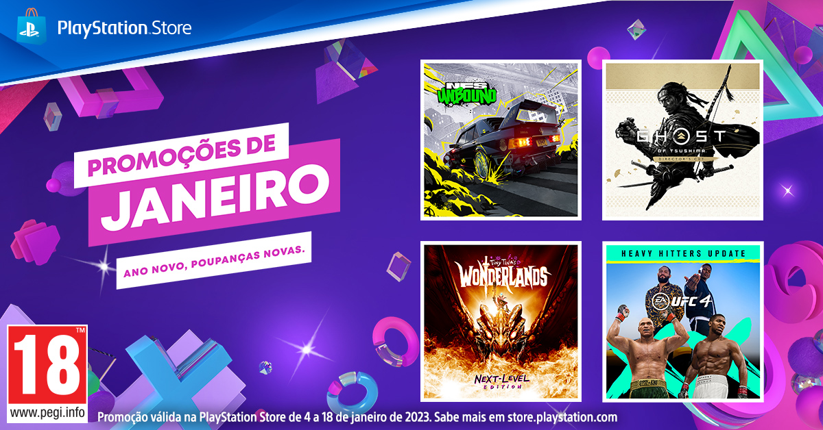 A Sony anunciou o arranque da segunda vaga das Promoções de Janeiro da PlayStation Store, que traz incríveis descontos em grandes títulos para a PlayStation 5 e para a PlayStation 4. A maior promoção do ano na PlayStation Store prolonga-se até ao próximo dia 18 de janeiro. Need for Speed Unbound, Ghost of Tsushima Director’s Cut, Tiny Tina’s Wonderlands: Next-Level Edition e UFC 4 são alguns dos títulos em destaque.